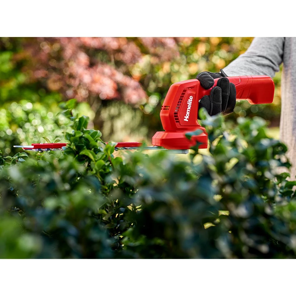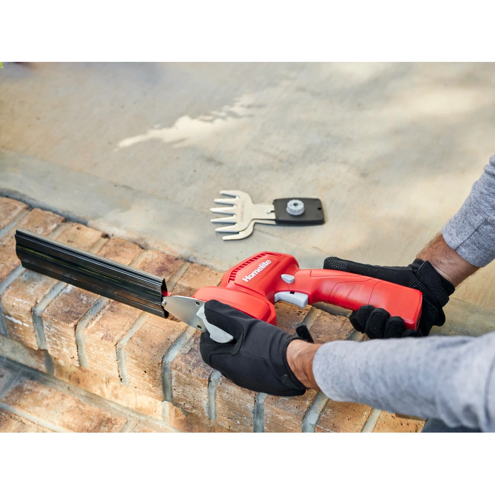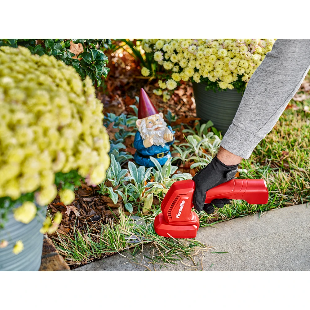Experience the convenience of 2 tools in 1 with the Homelite 12V Cordless Shear/Shrubber. This tool easily converts between a 4 in. grass shear and an 8 in. hedge shrubber. Designed with tool-free blade change, you can conveniently switch back and forth with no hassle. The lightweight and compact design provides comfortable use while trimming grass or shrubbing hedges. When you’re done with the job, simply use the included charging cable to recharge the 12V 2.5Ah internal battery. Conveniently store your shear/shrubber using the wall hook.