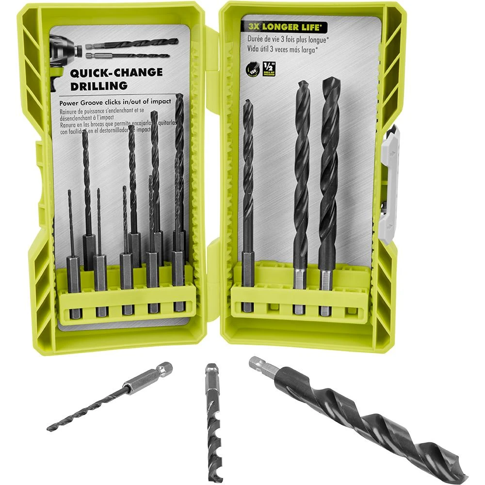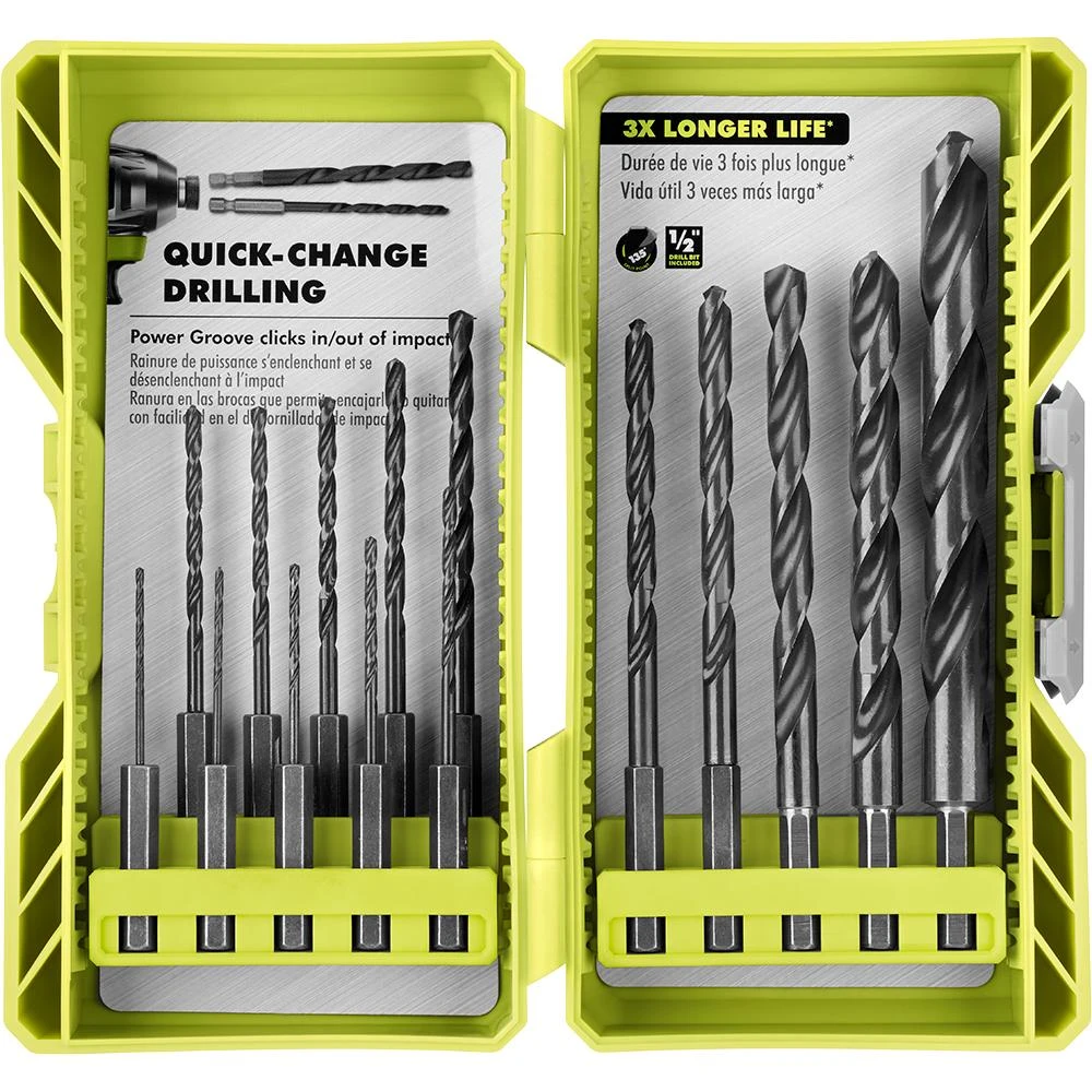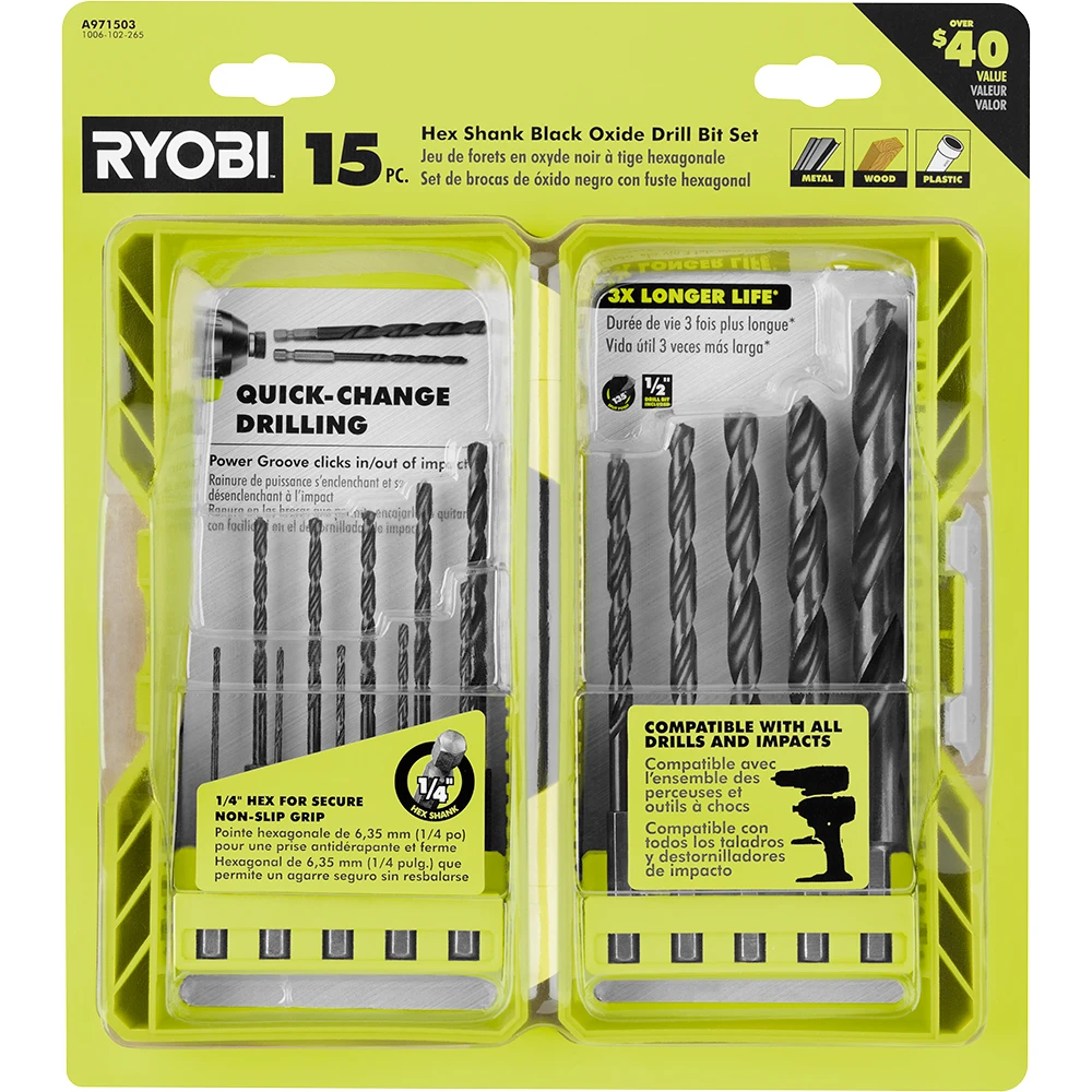 RYOBI introduces the 15-Piece Black Oxide Hex Shank Drill Bit Set. This assortment of drilling bits are perfect for a variety of materials including wood, metal, and plastic surfaces. The bits are constructed out of high speed steel with a black oxide finish to offer superior durability and 3X longer life. Another feature of these bits is the 135° split point to drill on contact and prevent your bit from walking. The 1/4 in. hex design provides secure grip into the drill chuck to prevent slipping of the bit. The 1/4 in. hex designs provides easy bit removal for quick changes between drill and drive bits. The compact case for easy bit access and mobility. This wide assortment, ranging from 1/16 in. to 1/2 in., guaranteeing a bit for all your project’s needs.