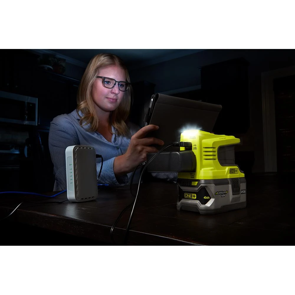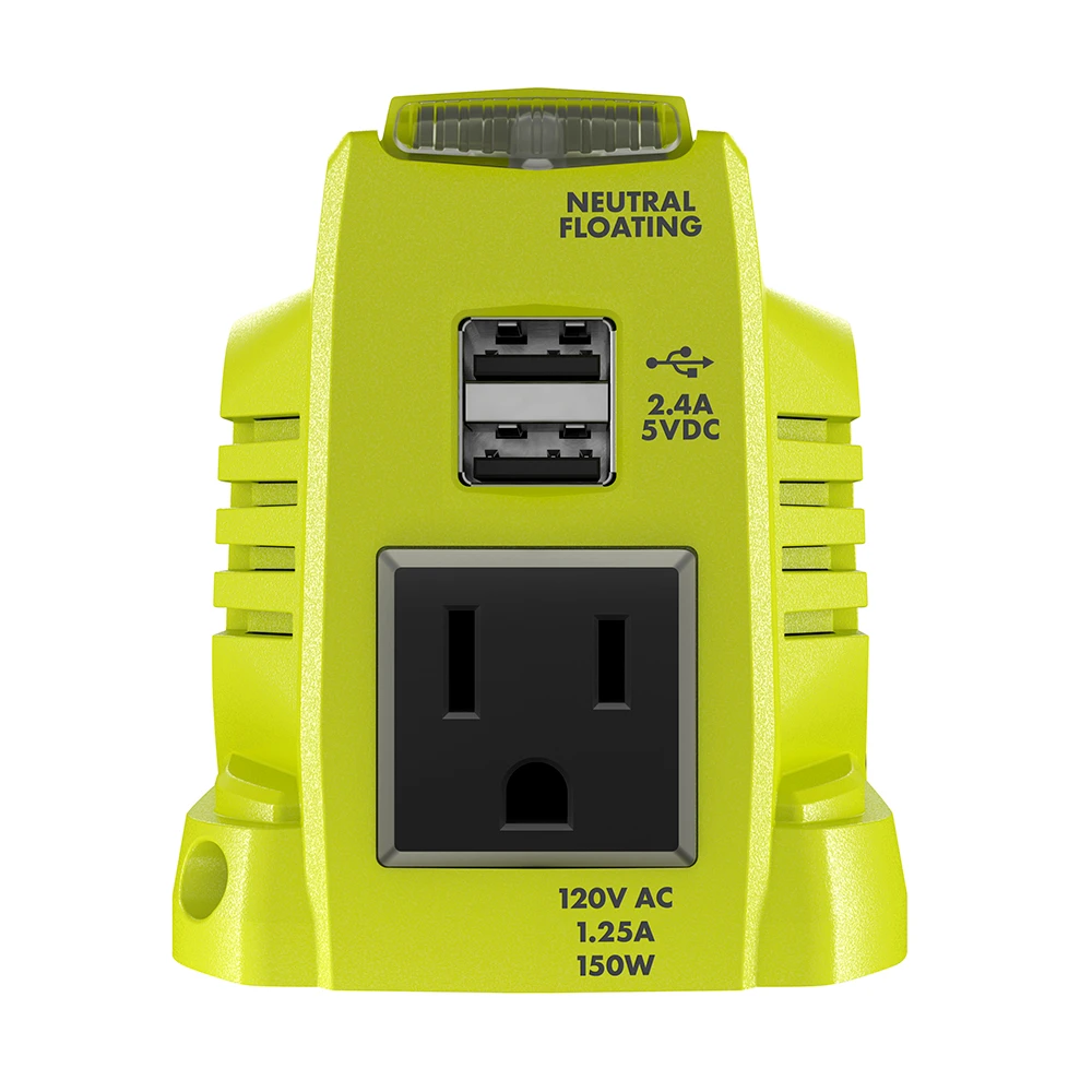 The RYOBI One+ 18-Volt Power Source provides convenient, on-the-go power both on and off the jobsite. With a modified sine wave and 150-Watt of continuous output, this inverter is perfect for powering laptops, tablets, cell phones and other small electronics. This compact and lightweight design is compatible with all of your existing RYOBI One+ batteries making endless power even easier. Equipped with 2 USB outlets and one 120-Volt wall outlet for convenient and reliable power.