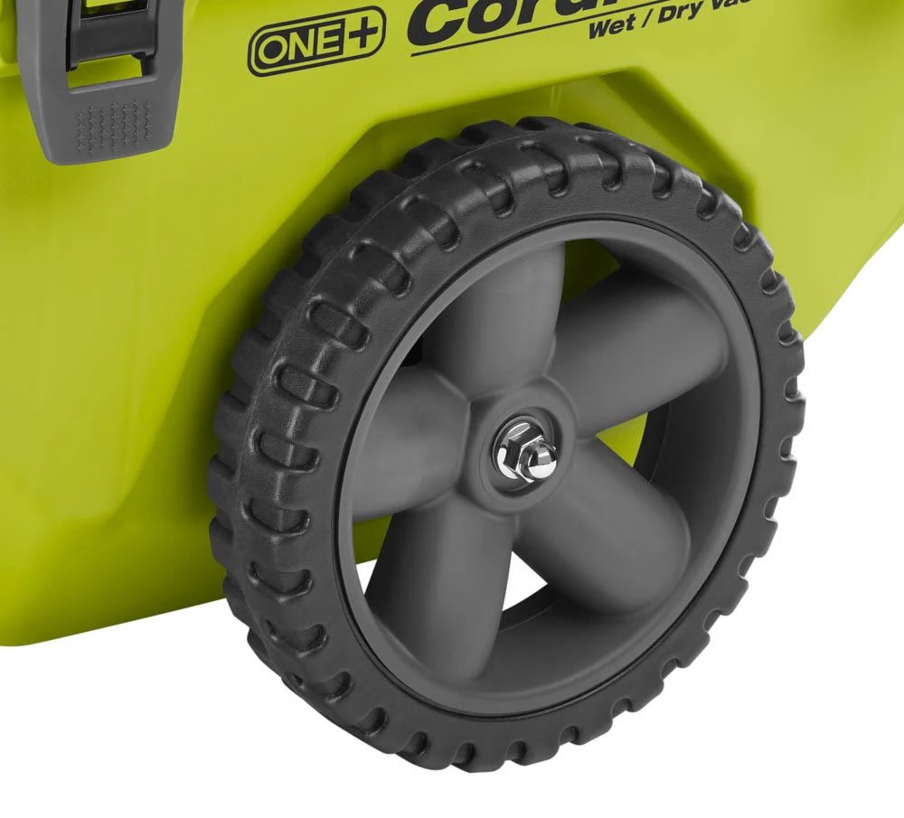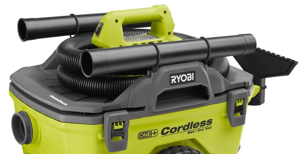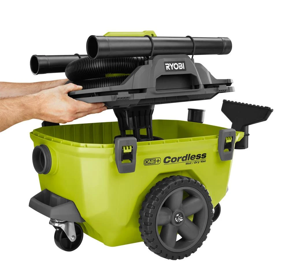 RYOBI introduces the 18 Volt ONE+ Lithium-Ion Cordless 6 Gal. Wet/Dry Vacuum This vacuum has a powerful 80 CFM. The multi-size no-tip wheel design and 360° mobility keeps your vacuum balanced when rolling over cords and thresholds. On-board accessory storage conveniently holds your crevice tool, floor nozzle, and extension wands while the hose dock provides a simple solution to storing your hose when not in use. Multiple carrying handles allow for easy carrying and the removable top makes emptying dust, debris, and liquids quick and mess-free. The compact design allows for space-saving storage when not in use.