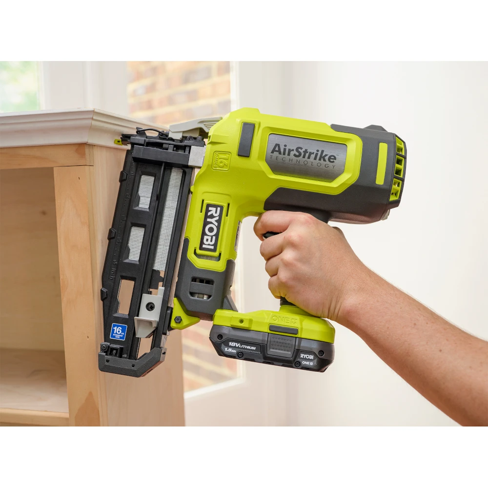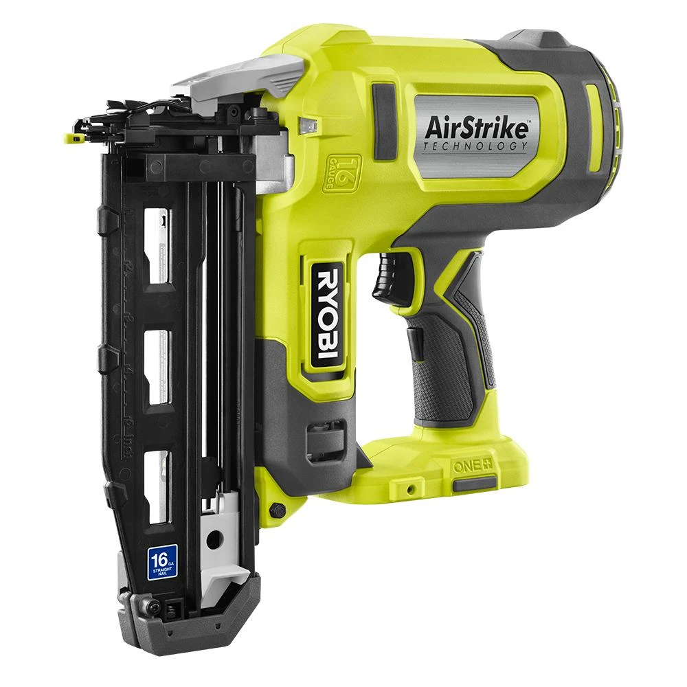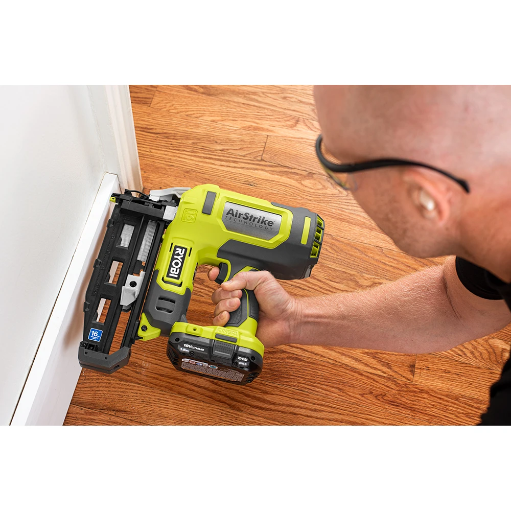 Expand your RYOBI 18V ONE+ System with the 18V ONE+ Cordless AirStrike 16-Gauge Straight Finish Nailer (Tool Only). This Finish Nailer features AirStrike Technology, which eliminates the need for noisy compressors, bulky hoses, or expensive gas cartridges. This means faster setup and easy maneuverability on the job site. This Straight Finish Nailer is capable of sinking up to 2-1/2 in. nails in hardwoods. The tool-free depth of drive adjustment allows for proper setting of nail heads. This nailer allows for extended periods of continuous work by sinking up to 1,000 nails per charge. It additionally offers a 78% smaller nose for tight spot access and superior drive quality, compared to P325. There is also a convenient adjustment dial to regulate air pressure speed for optimal performance. Great for crown molding, baseboard and exterior trim, this Finish Nailer is the perfect addition to any carpenter or DIYer’s tool collection. Best of all, it is part of the RYOBI ONE+ System