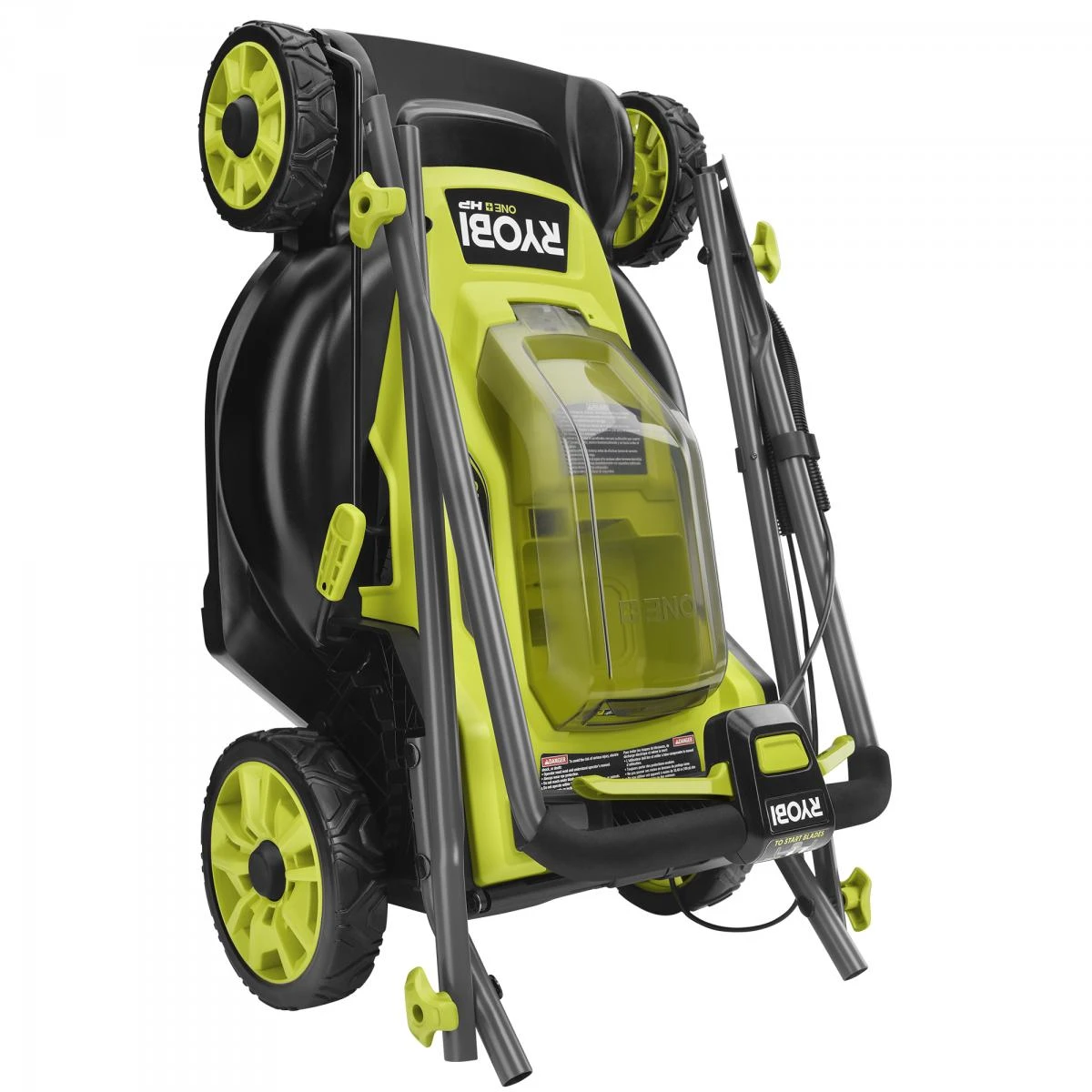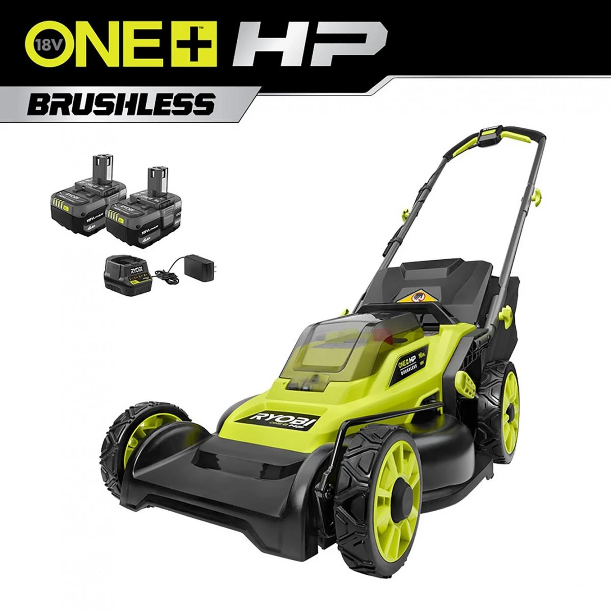 he 16 in. RYOBI 18V ONE+ HP Brushless Mower easily starts with the push of a button and mows up to 40-minutes or 1/3 acre or less with both included batteries. The premium HP brushless motor provides more power, longer runtime, and a longer motor life. Simply insert the included battery and you’re ready to mow in-seconds without the hassle of gas or oil. This mower includes convenient features like a single point height adjustment, 2-in-1 mulching and bagging functions, and easy lift bag removal. The compact, lightweight design makes it easy to carry from one place to another, and the handles fold for convenient, vertical storage when the job is done.
