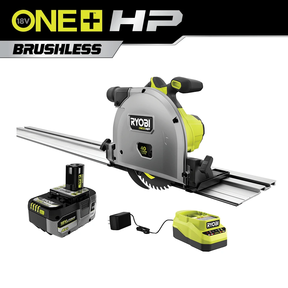 Enhance your RYOBI 18V ONE+ System with the RYOBI 18V ONE+ HP Brushless 6-1/2 in. Track Saw. ONE+ HP Technology combines a powerful brushless motor, advanced electronics, and HIGH PERFORMANCE lithium-ion batteries to deliver up to 260 linear feet of cutting per charge, when paired with the included 4.0 Ah HIGH PERFORMANCE battery. Combine (2) 27.5 in. included tracks for up to 55 in. of controlled, accurate cuts, and add additional tracks for extended continuous cutting. This saw can make -1° to 48° bevel cuts and has a 1-15/16 in. depth of cut capacity at 90° (with track). Make controlled and accurate cuts quickly, with up to 4,300 RPM. Cut with confidence, as this saw comes equipped with an adjustable depth control switch and depth scale for precise score and plunge cuts, as well as a track adjust and anti-tip adjustments to ensure smooth and accurate cuts. An additional 55 in. Track For Track Saw with (2) 27.5 in. Tracks, and (4) Connector Bars are sold separately as an accessory, Model A73TS01N. Best of all, it is part of the RYOBI 18V ONE+ System
