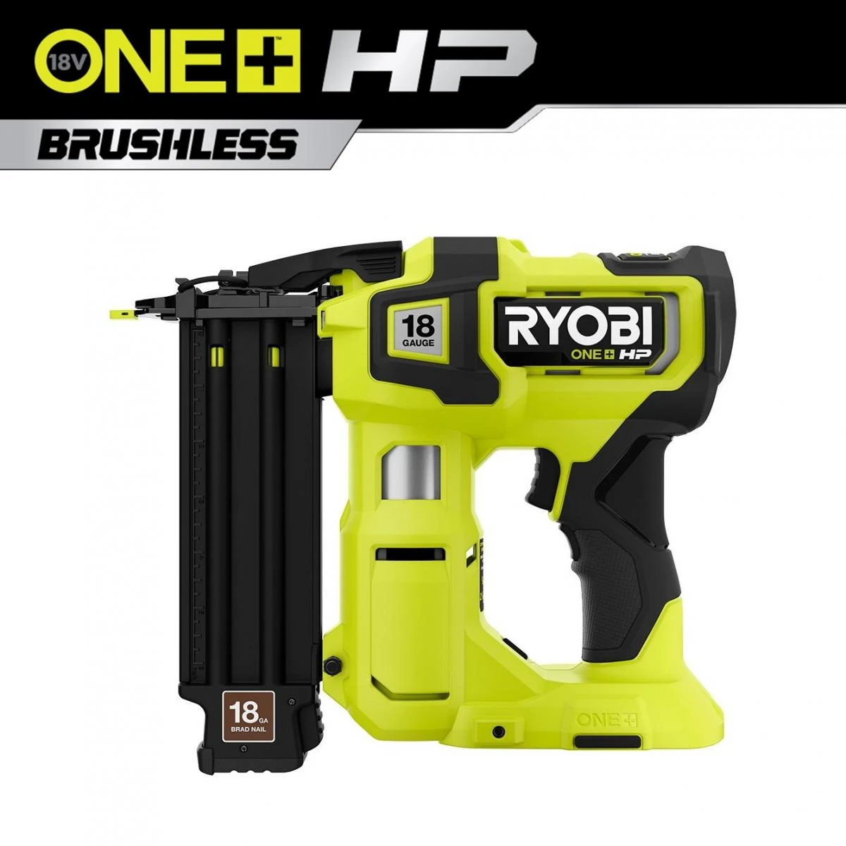 Expand your RYOBI 18V ONE+ System with the 18V ONE+ HP Brushless AirStrike 18-Gauge Brad Nailer (Tool Only). This ONE+ HP Brushless Brad Nailer features AirStrike Technology, which eliminates the need for noisy compressors, bulky hoses, or expensive gas cartridges for faster setup and easy maneuverability on the job site. The ONE+ HP Brushless Brad Nailer is capable of sinking up to 2-1/8 in. nails in hardwoods. It also features the innovative AccuDrive nose, which offers a superior line of sight to the user, resulting in precise and accurate nail placement, even in tight spaces. ONE+ HP Brushless Technology delivers more power and runtime, with the ability to drive up to 2,250 nails per charge and 60% more nail driving power, compared to the brushed model. There is a tool-free depth of drive adjustment and air pressure speed dial that allow for proper setting of nail heads in any application. Also featured is a tool-free jam release latch to quickly and easily clear nails in case of a jam, and a LED light for work in low light situations. Great for window, door and cabinet trim, this ONE+ HP Brad Nailer is the perfect addition to any carpenter or DIYer’s tool collection.