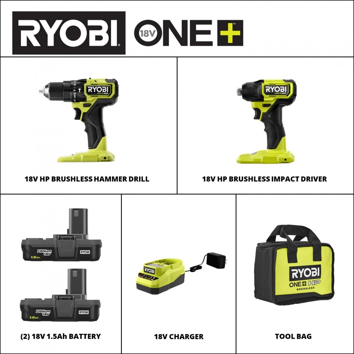 RYOBI 18V ONE+ HP Brushless 2-Tool Combo features a brushless motor that gives them longer run time for faster jobs. The Hammer Drill is 29% more compact, giving you better access into tight workspaces and overhead applications. This Compact Hammer Drill provides up to 2X more runtime than the brushed model, allowing users to get more done per battery charge. The Impact Driver is 26% more compact and over 23% lighter than the brushed version making it ideal for working in tight spots and completing overhead applications without strain.