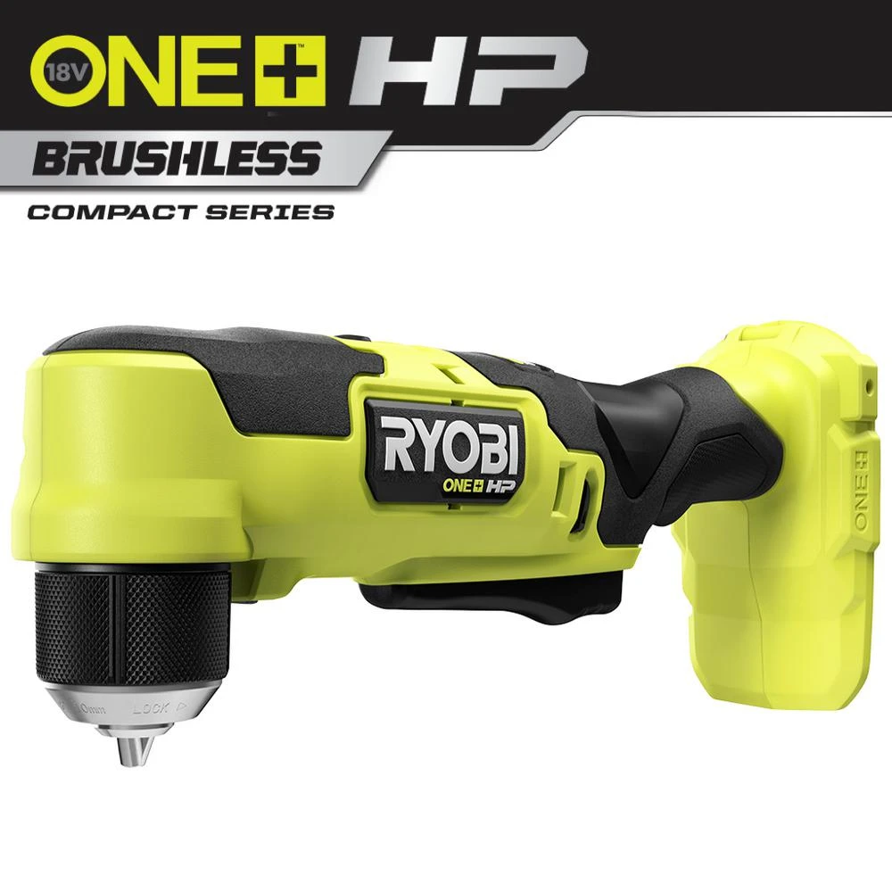 RYOBI introduces the ONE+ HP 18V Compact Brushless 3/8 in. Right Angle Drill (Tool Only). Need to tackle a wide range of close quarter drilling and fastening applications? Then the RYOBI ONE+ HP 18V Compact Brushless 3/8 in. Right Angle Drill is for you. At just 3.6 in. in length, this drill lets you work in tight spaces and complete overhead applications for prolonged periods of time without experiencing strain. It also features dual speed ranges at 0-450 / 0-1,700 RPM, which allows for more flexibility during a wide range of applications. The brushless motor delivers up to 350 in./lbs. of torque for maximum power. And for quick bit changes, the 3/8 in. single sleeve chuck with unique knurling pattern provides a firm grip. You’ll also appreciate its ergonomics: the variable speed paddle trigger is designed for comfort and convenience, making it easier to grip in multiple positions no matter the space. Best of all, it is part of the RYOBI ONE+ System of over 225 cordless tools that all work on the same battery platform. Batteries and chargers are sold separately.