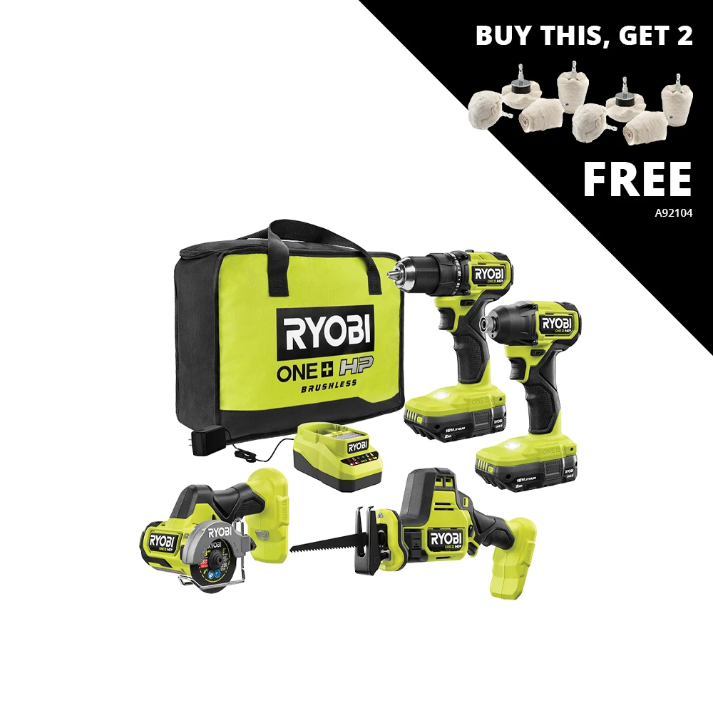 Enter the RYOBI 18V ONE+ System with the RYOBI 18V ONE+ HP Compact Brushless 4-Tool Combo Kit – 1/2 in. Drill/Driver, 1/4 in. Impact Driver, One-Handed Recip Saw, Cut-Off Tool, (2) 18V ONE+ 2.0 Ah Lithium-ion Battery, Charger and Tool Bag. ONE+ HP Technology delivers more power, runtime, durability, and speed utilizing brushless motors, advanced electronics, and HIGH PERFORMANCE lithium technology. Our compact tools are the lightest and smallest we have ever made, while still delivering optimal power to get the job done. The 1/2 in. Drill/Driver is just 6.4 in. in length and delivers 400 in./lbs. of torque. The 1/4 in. Impact Driver delivers up to 1,700 in./lbs. of torque and up to 3,800 IPM. The One-Handed Recip Saw is 13 in. in length and delivers speeds of up to 3,000 SPM. The Cut-Off Tool produces up to 19,500 RPM to cut through tough materials like metal, plastic, tile, cement board, drywall, wire shelving, PVC and vinyl siding. The 18V ONE+ 2.0 Ah Lithium-ion Batteries feature an integrated high visibility fuel gauge to monitor remaining runtime. Best of all, this kit is part of the RYOBI 18V ONE+ System