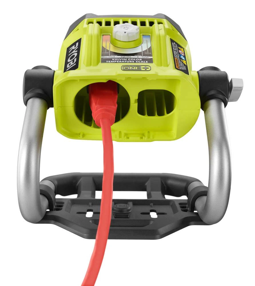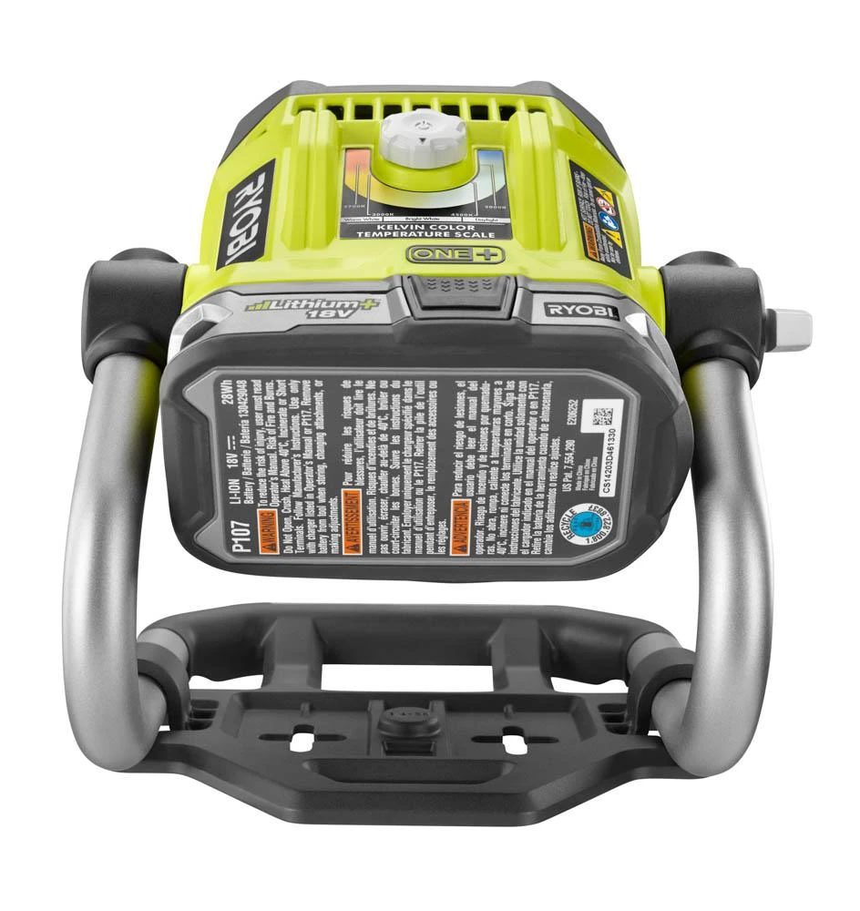 RYOBI introduces the 18-Volt ONE+ Hybrid LED Color Range Work Light (Tool Only). Variable color temperature adjusts from 2700K to 5000K degrees to give you the most accurate view of your workspace. Equipped with CREE LEDs, this light projects over 1200 Lumens of light. The adjustable knob correlates light temperature for improved color perception. This light feature 360° light head rotation for a variety of positions and HYBRID technology, allowing for use with a RYOBI ONE+ battery or AC extension cord.