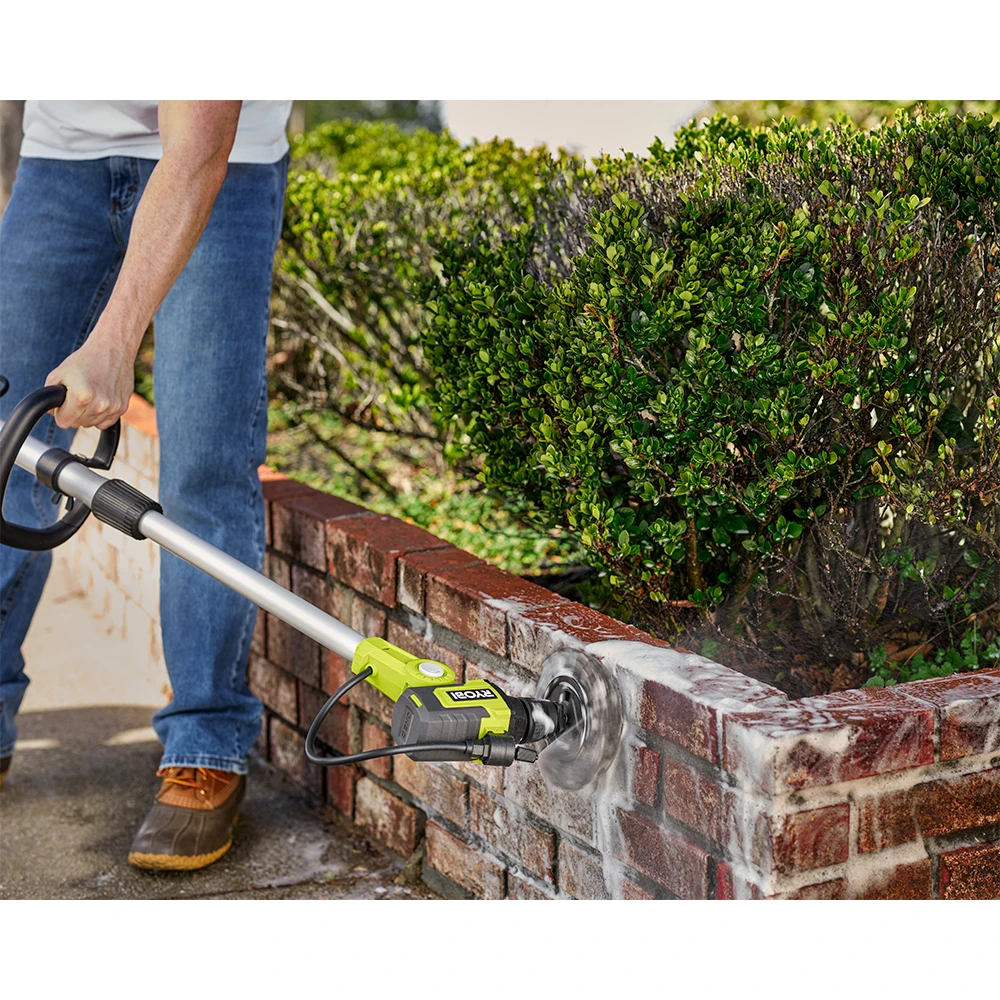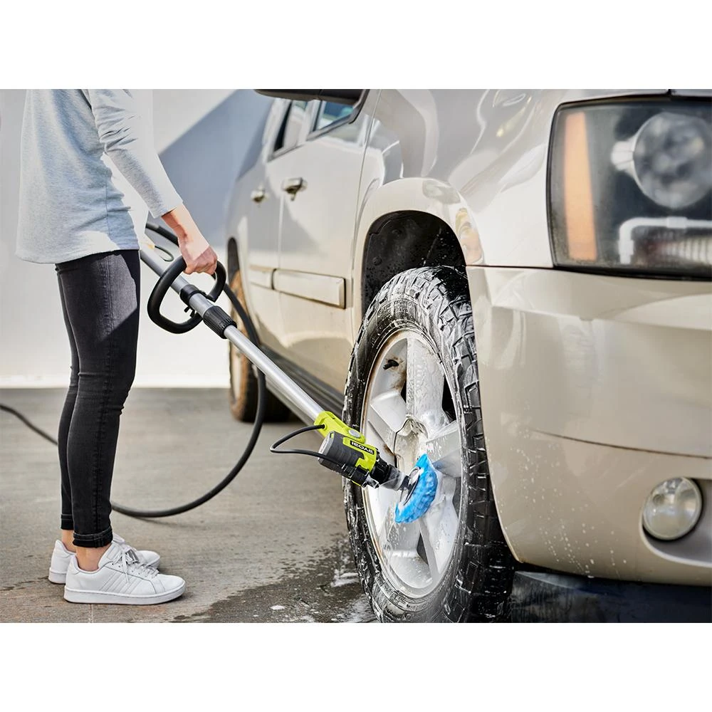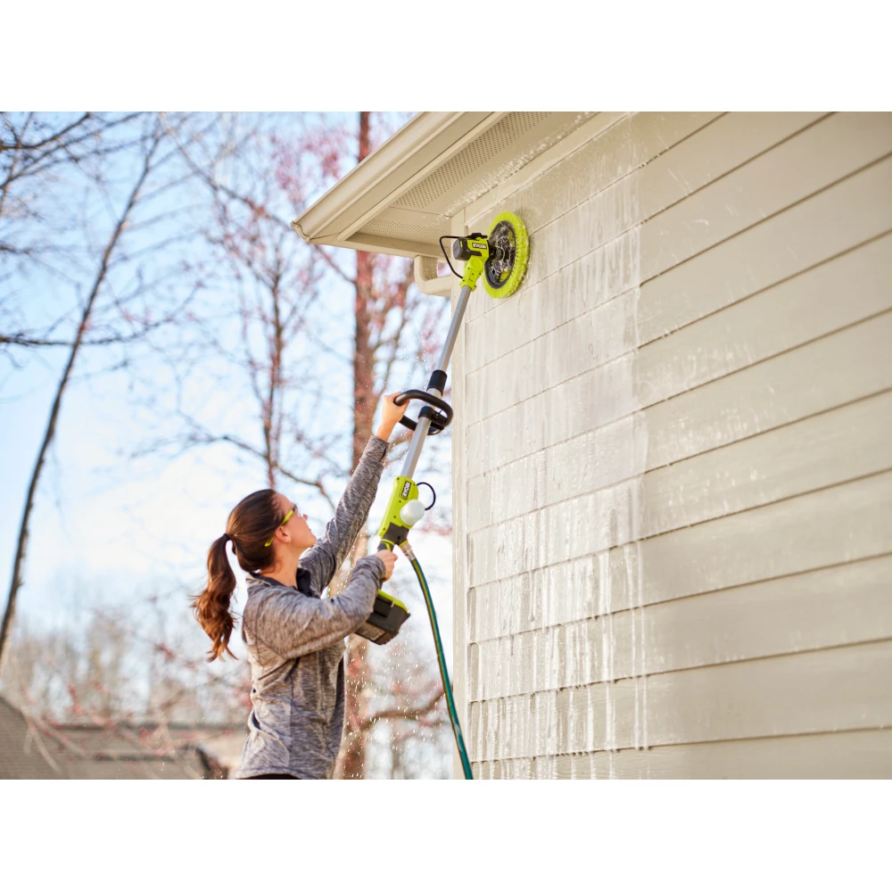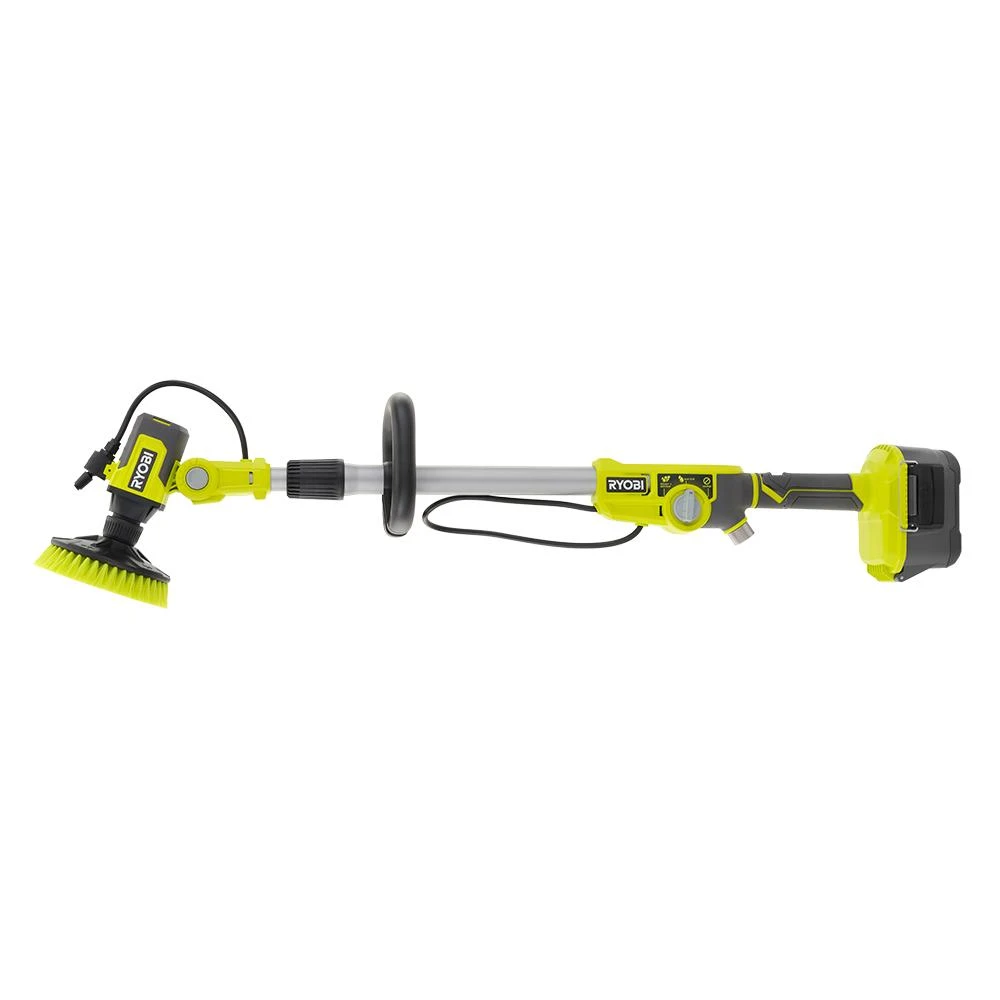 Enhance your RYOBI 18V ONE+ System with the 18V Soap Dispensing Telescoping Scrubber. Pick up this motorized scrubber and leave the sponges in the garage along with the backache that comes along with traditional cleaning methods. The cordless portability and lightweight design is perfect for cleaning on the go. The convenience of the 18V Soap Dispensing Telescoping Scrubber is having the power to do it all with cordless freedom; spray the included RYOBI Soap Solution, turn on the scrubber and let it do the work. This improved telescoping scrubber gives an effortless cleaning experience with soap and water dispensing technology. It is compatible with over 25 Hex Shank and Triangle Connector accessories – ranging from plush microfiber to abrasive bristles (sold separately). The included 6 in. Medium Bristle Brush is ideal for cleaning tile, fiberglass, siding, and more. The 6 position pivoting head and 51 in. telescoping pole allows cleaning in hard to reach areas. Clean with confidence knowing the scrubber’s battery enclosure is IPX7 Water Resistance Rated, meaning this tool can be submerged in up to 3 feet of water for 30 minutes. Best of all, it is part of the RYOBI 18V ONE+ System
