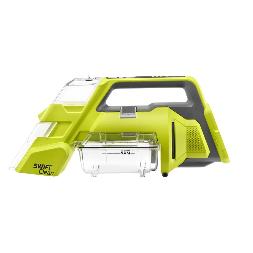 Expand your RYOBI 18V ONE+ System with the 18V ONE+ SWIFTClean Spot Cleaner. The SWIFTClean is ready for life’s everyday spills and messes. Pick up your cordless SWIFTClean and leave the hand brushes in the garage, along with the backache that comes along with traditional, manual cleaning methods. This spot cleaner is ideal for fresh spill clean-ups. The powered scrub brush agitates and lifts debris for effortless cleaning on upholstery, car seats, stairs, carpets and more. The cordless portability and lightweight design is perfect for cleaning immediate messes to prevent set in stains. The convenience of the RYOBI SWIFTClean is having the power to do it all with cordless convenience; precisely spray the solution, agitate with the powered brush, then lift the mess with the powerful suction. The SWIFTClean is not ideal for set-in stains. The included 6oz RYOBI OXY Cleaning Solution is a ready to use formula which means there’s no diluting, no mixing and no hassle. All clear components of your SWIFTClean are top rack dishwasher safe for easy tool maintenance and cleaning .