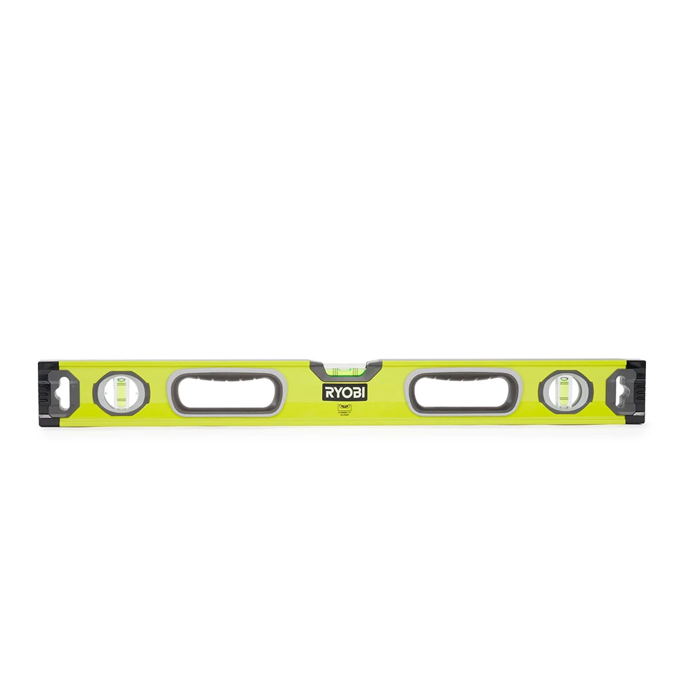 The RYOBI 24″ Magnetic Box Level is precision machined to provide .0005″/1″ accuracy. The heavy duty aluminum box beam construction, solid block vial casing and shock absorbing end caps provide maximum durability. Conveniently store with the strong magnetic hold or by using the hang hole.