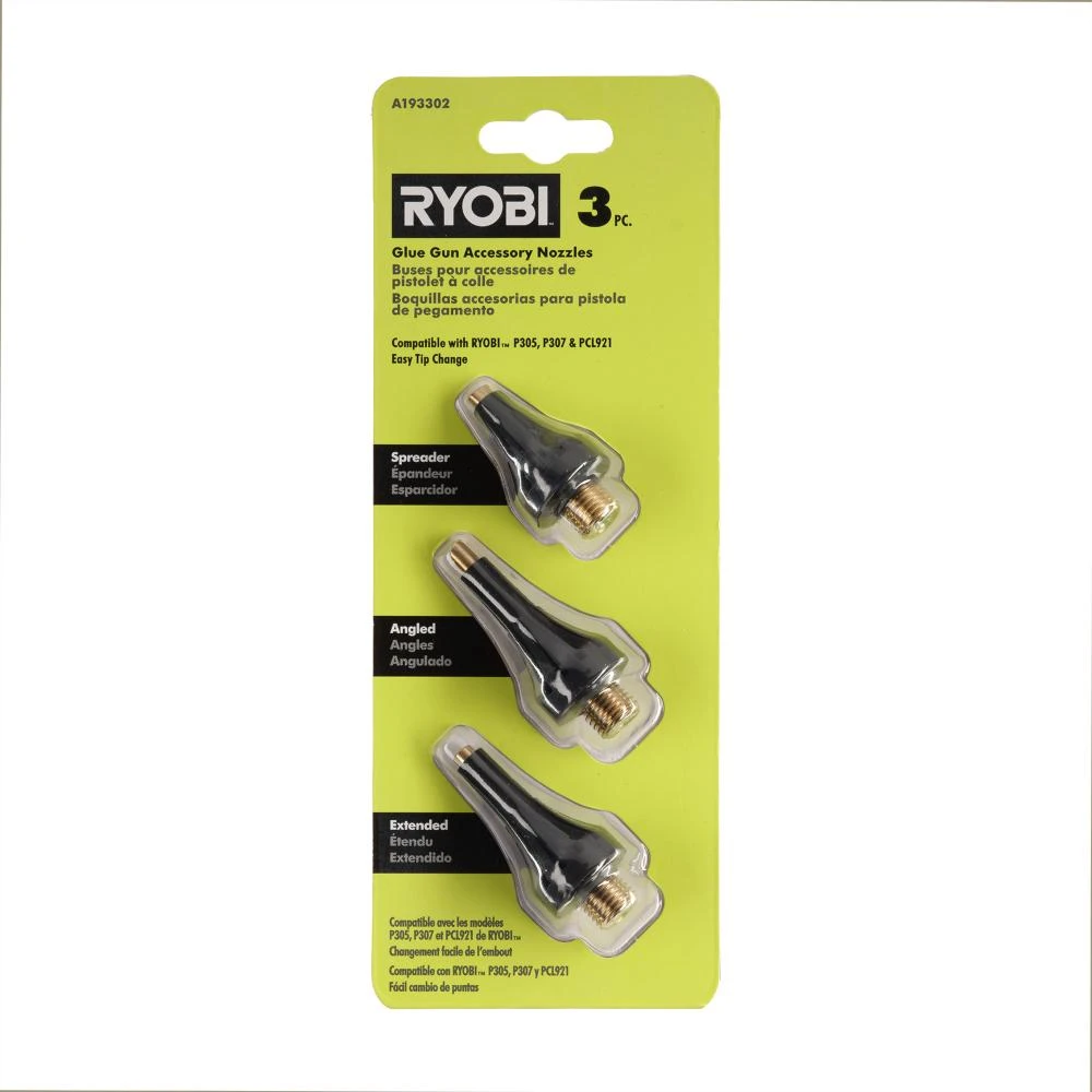 The RYOBI 3-Piece Glue Gun Nozzle Set features three nozzle types, Spreader Nozzle, Angled Extension Nozzle, and Extended Precision Nozzle. These three prepare you for any glue gun project you may have. The easy tip exchange allows you to move to different applications with ease. For best results, always pair your RYOBI tools with RYOBI accessories. The A193302 includes (1) Spreader Nozzle, (1) Angled Extension Nozzle and (1) Extended Precision Nozzle.