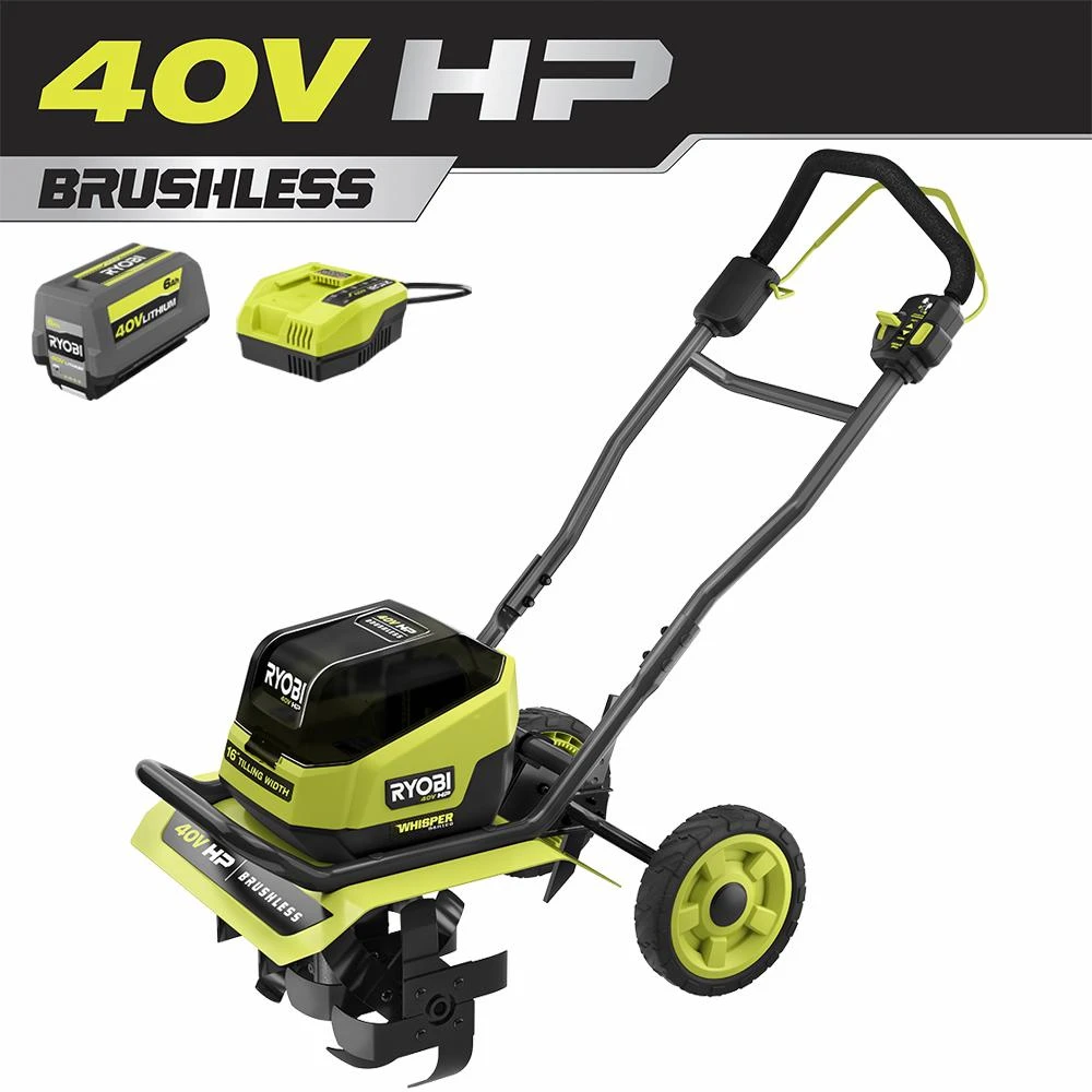 Power through your flower beds and gardens with the RYOBI 40-Volt HP Brushless 16 in. Front Tine Tiller. This tiller is a part of our WHISPER SERIES lineup, our quietest range of tools, allowing you to maintain your yard in peace without the headache or hassle of gas. The powerful brushless motor enables you to effortlessly till through a variety of soil types. RYOBI HP Technology and the 40-Volt 6.0 Ah Battery allow you to stand up to the most demanding jobs with just the push of a button. The 11 in.-16 in. adjustable tilling width, and 8 in. tilling depth is perfect for gardens, flower beds, and even breaking new ground. The variable speed lever and drag stake give you optimal control when tilling. The wheel axle has 3-positions that can easily be adjusted for deeper tilling or transport. Take advantage of the bull bar handle and add additional weight for deeper and more controlled tilling. The 10 in. wheels make transportation easy over any terrain. When the job is complete plug the included 40-Volt 6.0 Ah Lithium-ion battery on the included quick-charger to charge your battery in less than 90 minutes. The RYOBI 40-Volt HP Brushless 16 in. Front Tine Tiller is backed by a 5-year limited tool warranty and a 3-year limited battery warranty.