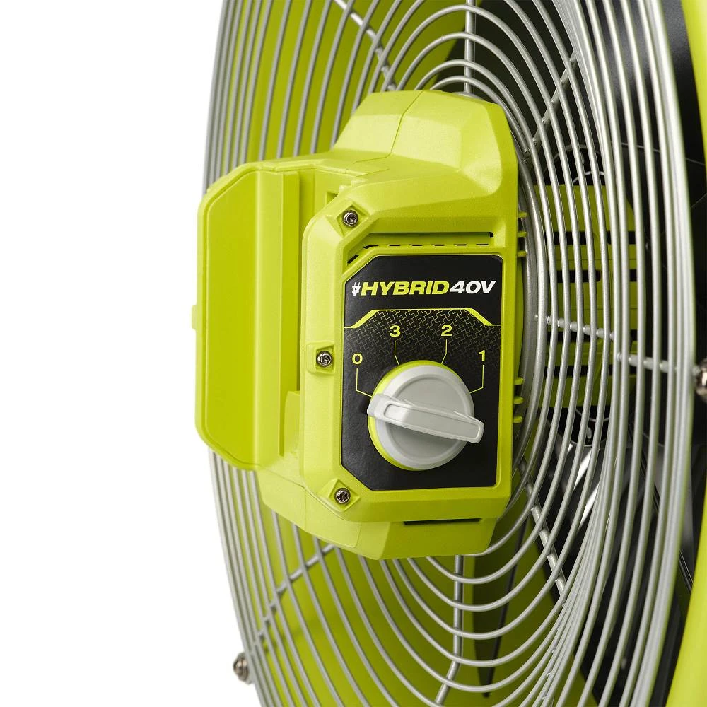 Expand your RYOBI 40V System with the RYOBI 40V Hybrid WHISPER SERIES 14 in. Air Cannon. This fan has maximum cooling with over 2,000 CFM while also being a part of our Whisper series: part of our quietest range of products utilizing advanced technology for reduced noise. Customize your airflow through 3 settings (high/medium/low), 225° pivoting head, and mounting options for precise air placement every time. With an added bonus, utilize the included barrel plug power adaptor (with integrated cord strap) to provide unlimited runtime.