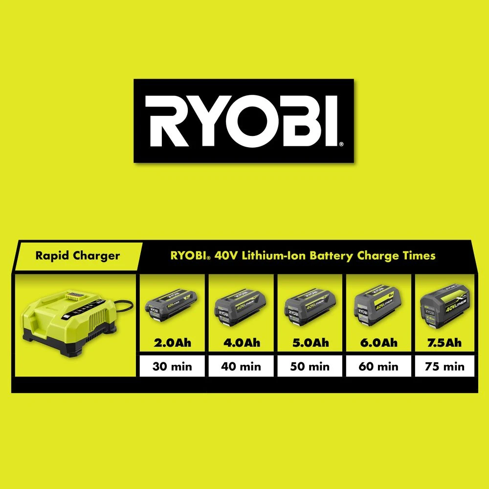 RYOBI introduces the 40-Volt Lithium-Ion Rapid Charger. Compatible with all RYOBI 40-Volt batteries. The indicator lights provide the battery charging status and even lets you know if the battery is too hot or too cold to charge. Spend less time charging batteries and more time getting yard work done. For charge times, reference the Charge Time Chart or look in the image carousel.
