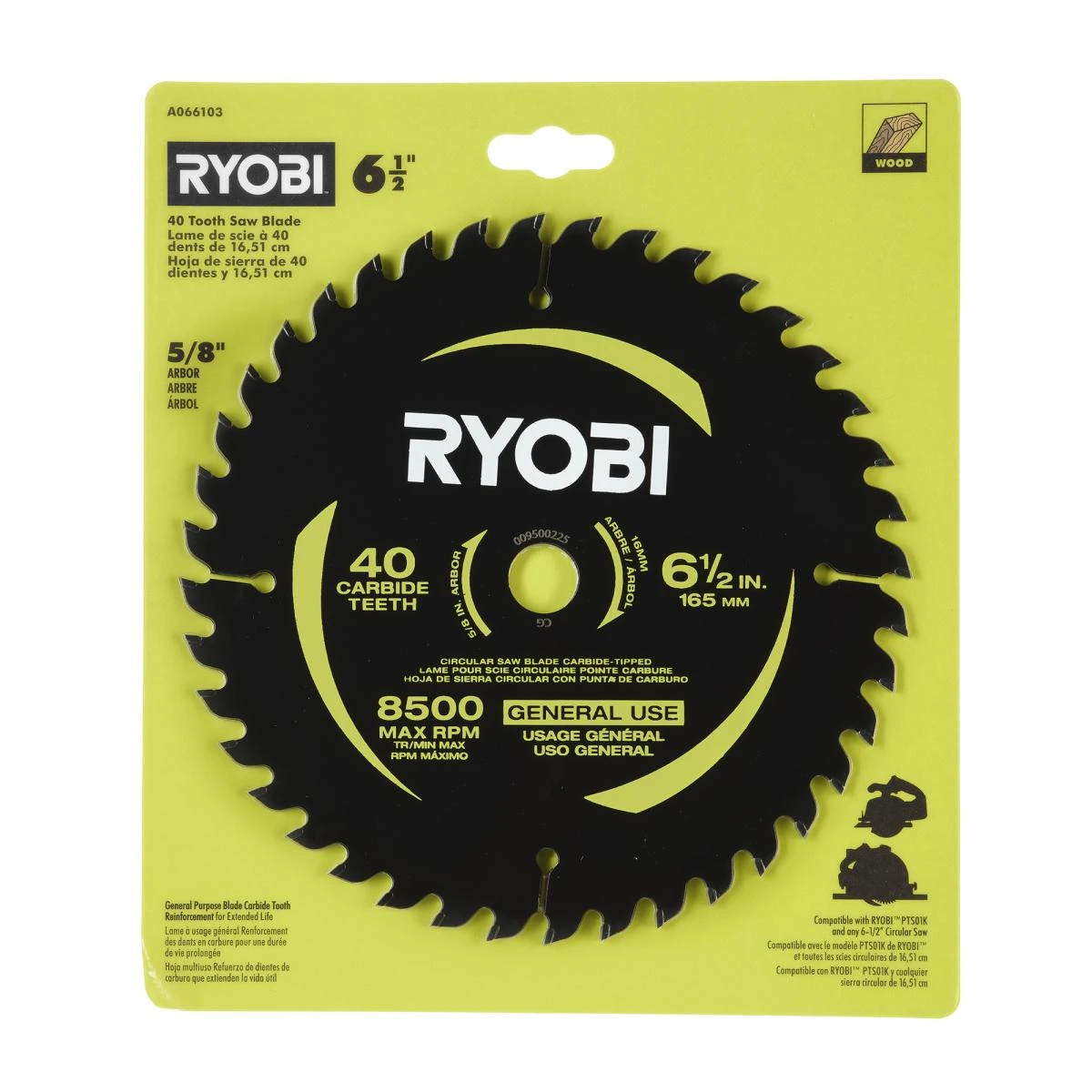 Compliment your cutting solutions with the RYOBI 6-1/2″ 40 Tooth Carbide-Tipped Blade. This blade features carbide tooth reinforcement for durability and extended life, so your blade stays sharper longer. Compatible with the RYOBI 6-1/2″ Track Saw (PTS01) and any 6-1/2″ circular saw, this blade is ideal for cutting hardwoods, soft woods, plywood and lumber. Finally, this blade has a maximum speed of 8,500 RPM and a 5/8″ arbor. Compliment your tool collection with RYOBI Accessories.