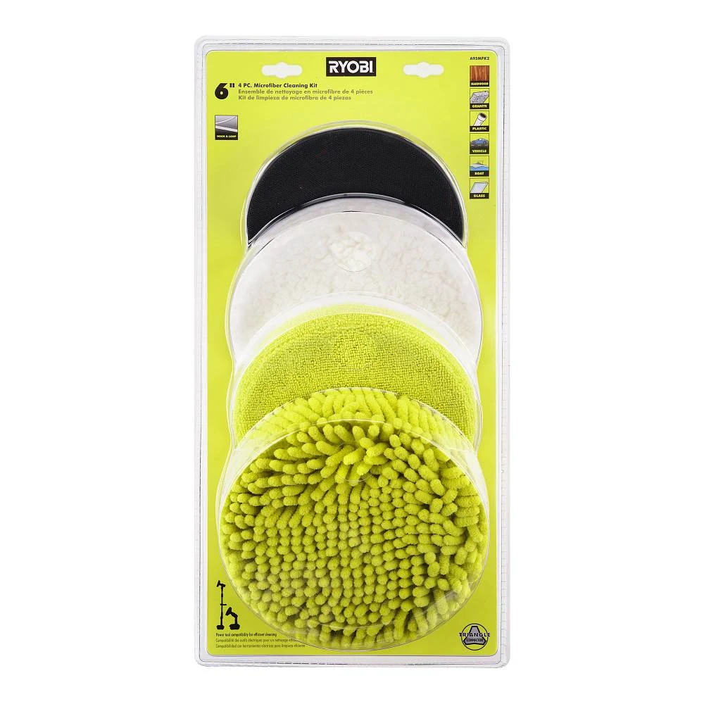 RYOBI introduces the 6 in. 4-Piece Microfiber Cleaning Kit to our cleaning category. The Knit Microfiber Head is ideal for cleaning granite, glass, plastic, and other surfaces. The Microfiber Cloth Head is ideal for cleaning hardwood, laminate, stainless steel and other surfaces. The Lambswool Head is ideal for waxing, buffing, and polishing a variety of applications. The 6 in. Hook and Loop System provides quick change adaptability with a variety of sponge and cloth heads. This system creates an anti-slip hold so the accessory head remains attached to the scrubber. These heads have a unique fitment to the backer that prevents accidental marring. The Triangle Connector allows the Hook and Loop System to be compatible with the RYOBI 18V ONE+ Power Scrubbers.