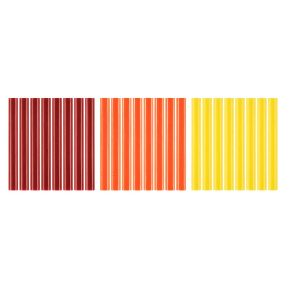 The RYOBI 24-Pack Full Size Warm Color Glue Stick set is perfect for use on wood, plastics, ceramics, fabrics, cardboard, and various fabrics. The dual melt capability prepares you for various applications. For best results, always pair your RYOBI tools with RYOBI accessories. The RYOBI A1932403 includes 8 red, 8 orange, and 8 yellow full size glue sticks.