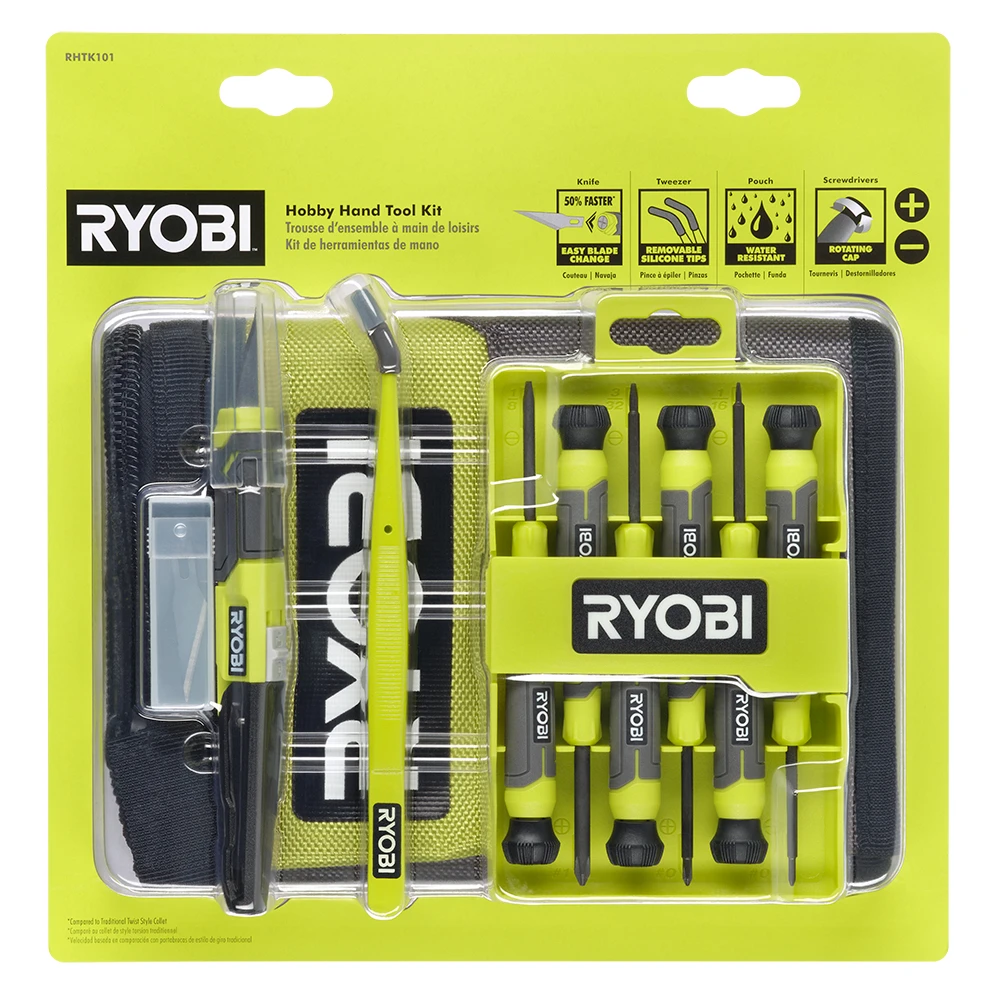 The RYOBI Hobby Hand Tool Kit is designed for precise applications. The Quick Change Hobby Knife provides a 50% faster blade change can be done in three quick steps, saving you time. The sharp #11 precision blades provide accurate cuts every time. The 6 PC. Precision Screwdriver Set has rotating caps, providing additional control and the tip identifiers allow for quick and easy screwdriver identification. The 6 in. Silicone Tipped Tweezers have a 6 in. reach for steady control. Conveniently remove or add the non-marring silicone tips for a variety of applications. The curved tips provide ultimate precision while the stainless steel body enhances durability. The 12 in. Zipper Pouch is designed with a heavy duty water resistant 1680D fabric. The stand-up base and integrated hang loop provides a variety of storage options. Durable metal zipper with pull tab for easy open/close.